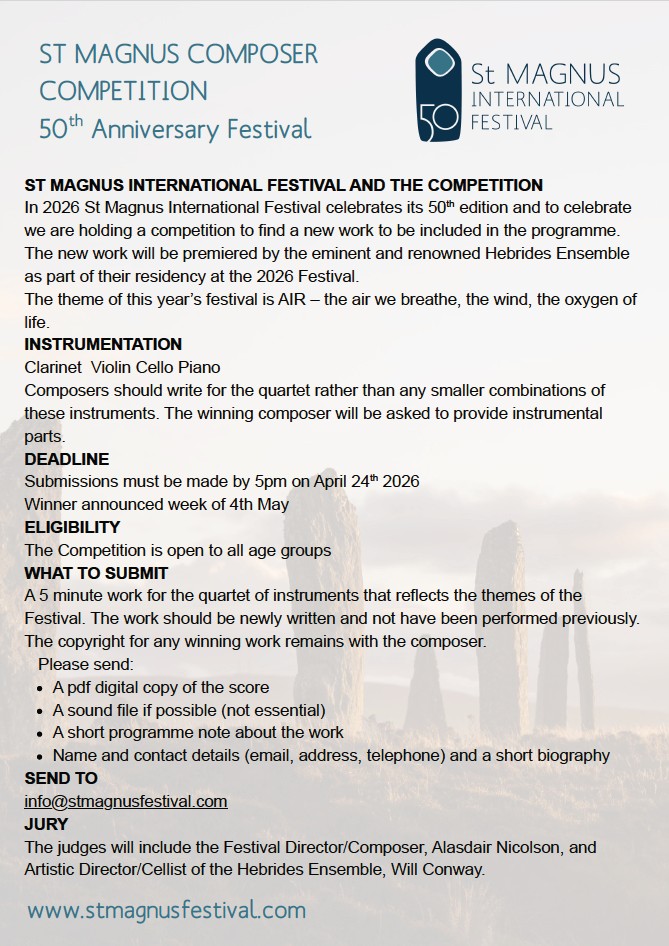 In 2026, St Magnus International Festival celebrates its 50th. To mark the occasion, we are holding a Composition Competition to find a new work to be included in the Festival programme. The winning piece will be premiered by the Hebrides Ensemble during their Festival residency. The theme of this year’s Festival is AIR – the air we breathe, the wind, and the oxygen of life.