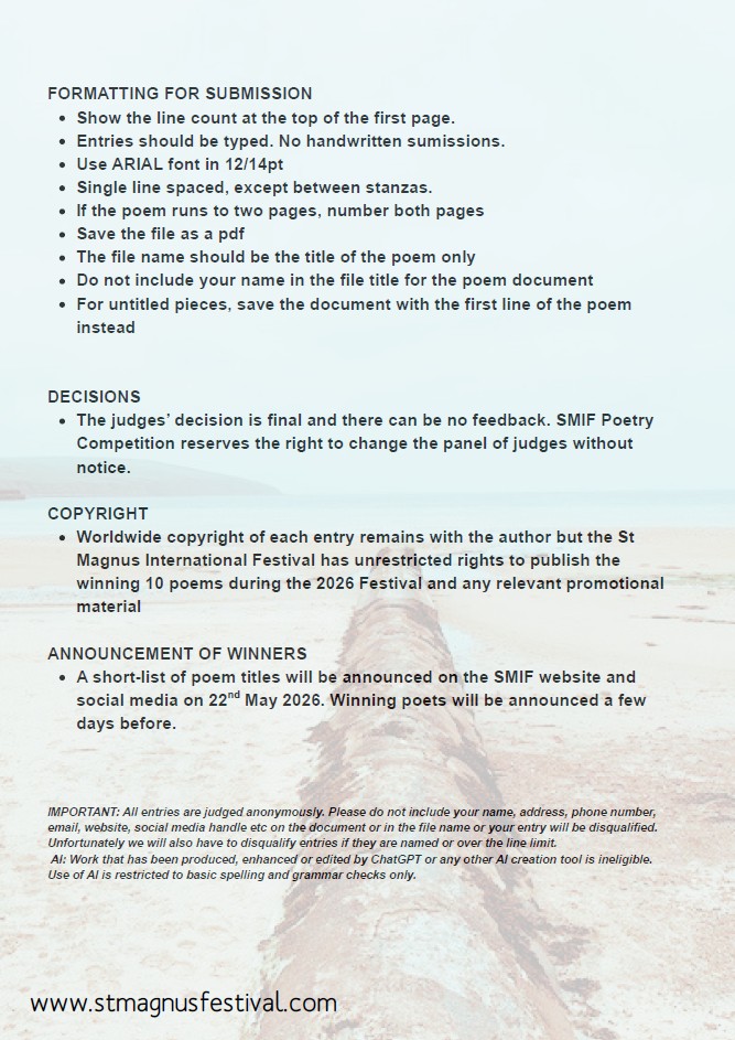 In 2026 we are holding a Poetry Competition to celebrate the Festival’s rich literary heritage, inspired by one of its founders, George Mackay Brown. Ten poems will be selected and published in a celebratory pamphlet, and will also be featured as readings on the Festival website as part of our online programme. The theme of this year’s Festival is AIR – the air we breathe, the wind, and the oxygen of life.